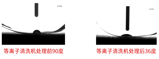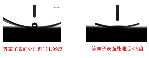 上面是陶瓷填充PTFE聚四氟乙烯薄膜等離子處理前后的水滴角對比